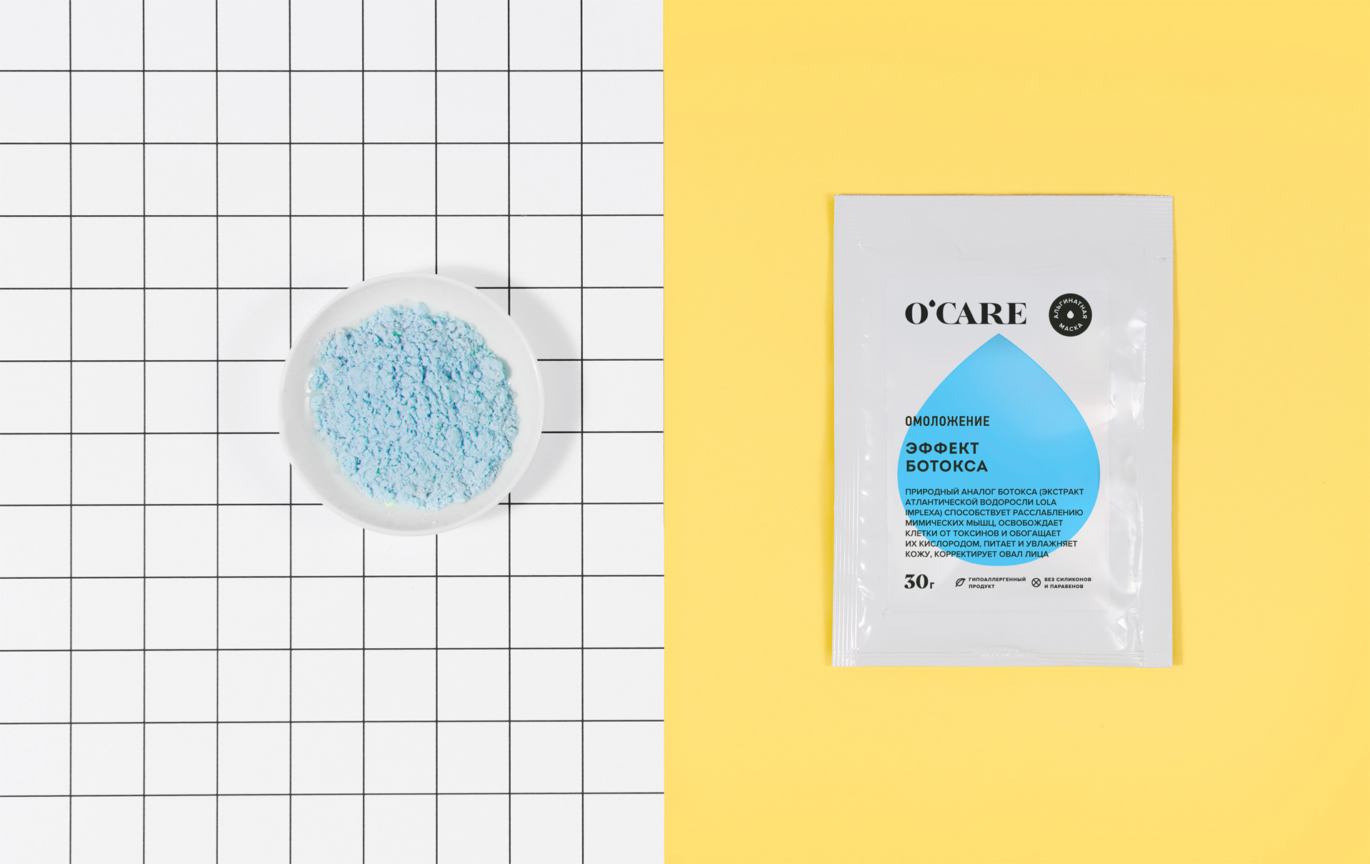 Мы придумали название, айдентику и дизайн упаковки для нового бренда, специализирующегося на косметике для женщин. Оснорвным продуктом O’Care являются альгинатные маски. Бренд производит около 20 видов масок.